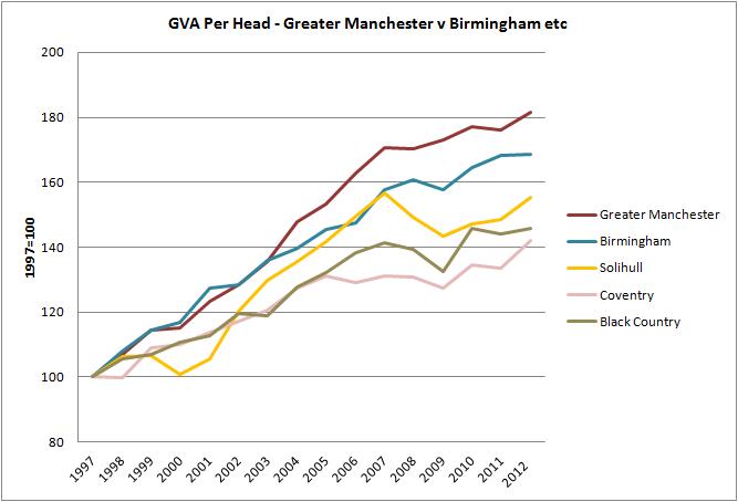 - All areas underperformed the Greater Manchester performance. Birmingham kept pace until roughly 2003 but then lost ground. Solihull made good progress in the 2000’s but slipped back during the recession