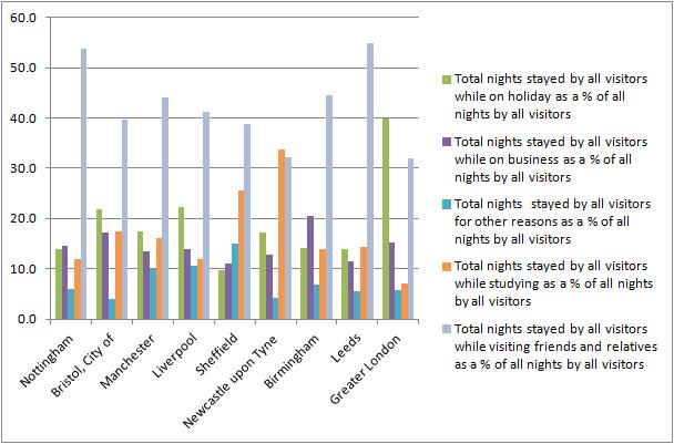 The ONS has just release figures for overseas visitors in England broken down at a County or Unitary Authority level. I have just had a quick play with these to pull out figures for the Core Cities (Not there CA/FUA definitions). These figures are averages from the period 2011-2013. The following graphic and table show […]